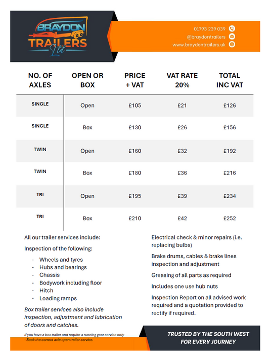 All our trailer servicing prices include single use hub nuts at no extra cost, so there are no hidden add-ons.